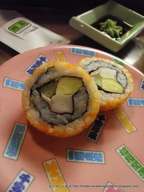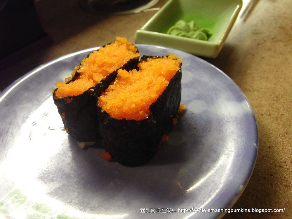 兩位友人陸續到步,看見條迴轉帶,來來去去也是那些,便要落order。傳說中明將的壽司飯,是熱的,即叫即做才見真章,不過在証實這個傳聞之前,再在迴轉帶上,取來一些軍艦壽司。蟹子壽司之前在迴轉帶上見不到,應該是剛剛才放上迴轉帶。如果是即做的軍襤,紫菜一定仍然帶脆,可惜這個蟹子壽司,外圍的紫菜,淋過濕紙巾,面頭的蟹子,似是染色體,一點味也沒有。