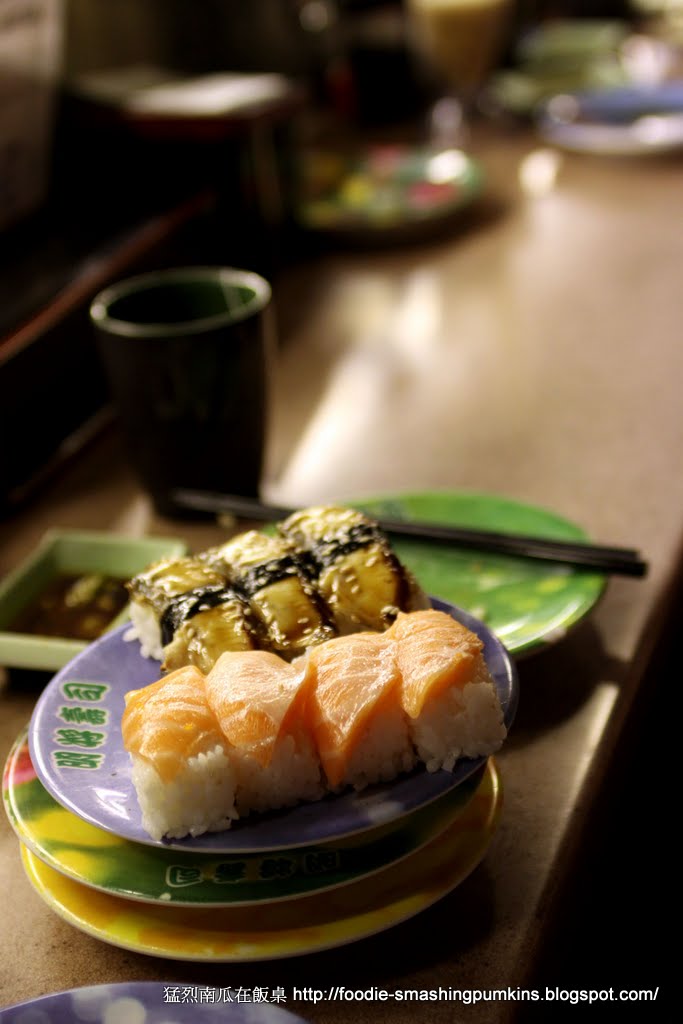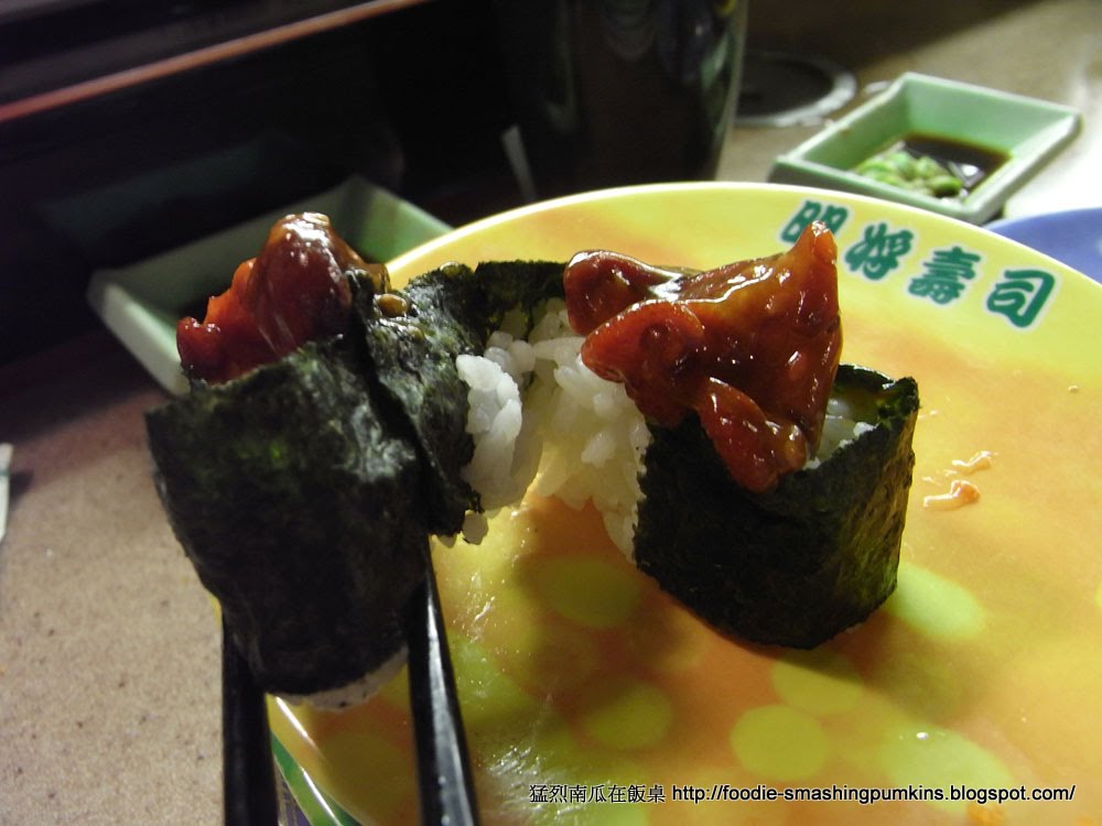 久問紅豆壽司大名,真是不得不佩服明將藝高人膽大,連紅豆也可用來做壽司,幾時會輪到叉燒,豬潤,午餐肉,豆豉鯪魚。。。甚至乎珍珠奶茶的珍珠壽司?見到迴轉帶上的紅豆壽司,懶理擺了多久,即刻先下一城。
