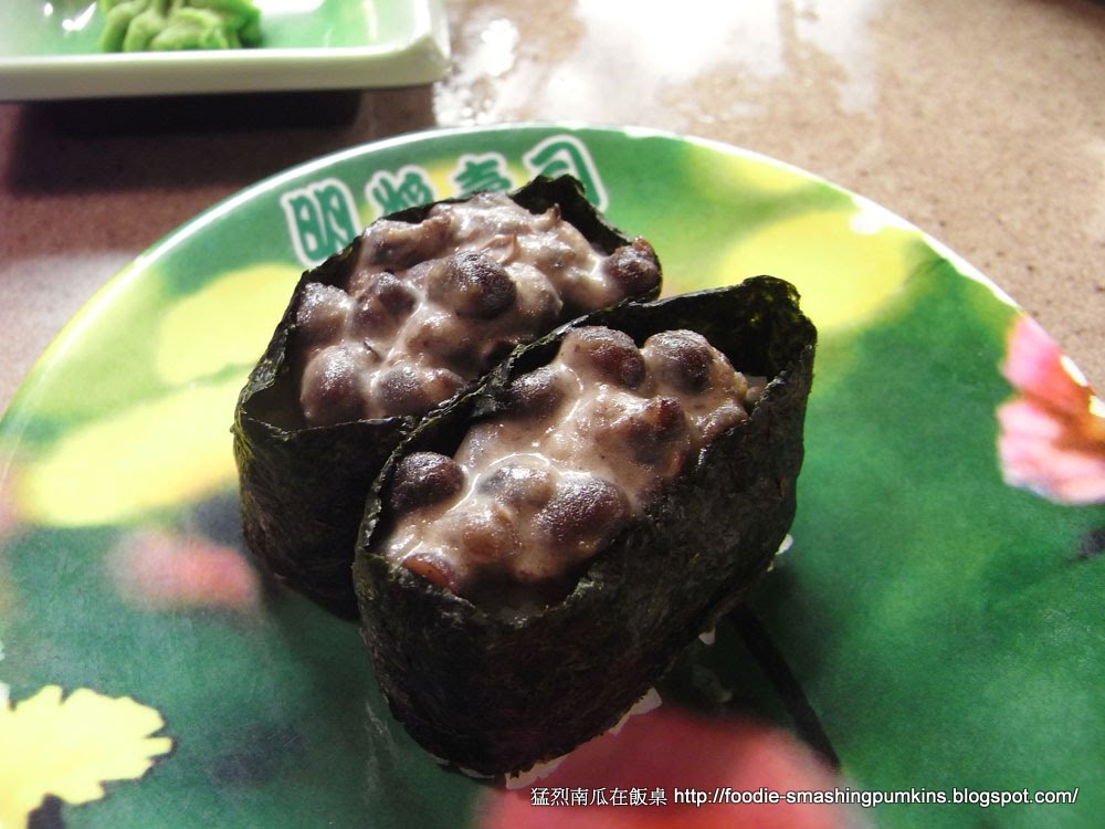 面頭的紅豆,有點似珍珠奶茶的珍珠,更有點似霉菌,賣相的確"驚喜"。入口一刻,成劈野之中,忽然有咬口,因為紅豆好硬。配上一點醋味也沒有,味如白飯的壽司飯,與受潮到淋的紫菜,心想是否吃著三流的份子料理?這個"三差激"組合,可不是講玩,小朋友吃之前,記得要PG家長指引。